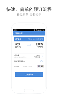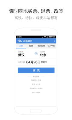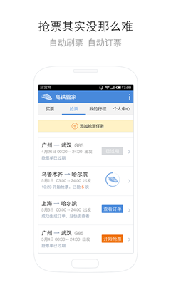 让是一款十分专业为了方便大家查询高速铁路列车时刻信息的一款好用应用,它不仅可以查到余票显示和车票价格,还可以收藏车次和详实的列车数据等服务,它被人们称之“航班管家”的兄弟产品,会为您提供全过程的商旅信息查询服务。有需求的用户赶快来下载吧。【软件特色】即日起,可在积分商城领取5元提现红包。购买火车票时使用,带着管家红包任性出行吧!每天有数万人通过高铁管家购买火车票,包含高铁、动车、普通车票。【自动抢票】一次能抢多张火车票,自动提交订单,再也不用担心买不到火车票了;【余票监控】实时监控网络退票和改签票,一旦有余票就抢;【身份核验】第一家完美对接12306最新发布的身份核验系统;【退票改签】随时随地在线购买火车票、退票、改签;【在线支付】支持支付宝、多家银行在线订购火车票,不产生其他任何费用,不强制购买保险;【官方数据】火车票数据来源12306官方网站,数据同步快速、及时、准确;【酒店预订】附近酒店轻松可查、可预订。高铁管家是“航班管家”的兄弟产品,会为您提供全程的商旅信息查询服务。【版本说明】v3.1.8更新说明:1.新增买票提醒。2.优化验证码。展开