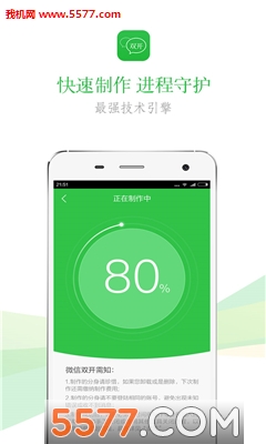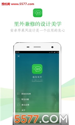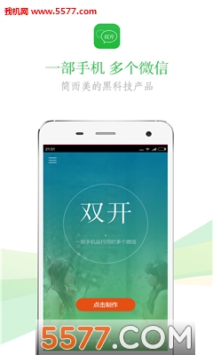 微信双开app软件是一款可以轻松帮助用户制作微信分身的手机软件,让用户可以轻松使用一个手机登陆两个微信账号,让你大号小号玩的更溜!【软件简介】微信双开(原微信双开助手)体验与官方微信一模一样,且支持最新正版微信,不占过多内存。您在使用微信的时候,有没有经常想拥有两个账号,一个工作号,一个生活号?福利来了,微信双开让您能够在手机上同时拥有微信多个账号,每个账号在各自独立的客户端里运行,之间相互独立,互不影响。微信双开,一个风格极简、干净的软件,让您的手机拥有无限可能,海阔天空任遨游!【软件特点】1.同一应用的两个账号同时在线。2.两个账号互相切换不影响。3.体验与官方应用一模一样,且是最新版本。4.制作完后的分身请第一时间添加到手机的白名单中。【版本说明】更新内容:1.同步支持最新官方版本,体验一模一样(体验超爽了);2.独有技术优势,制作分身效率提升500%;3.优化信息卡顿、通知栏等问题(添加白名单后),超赞;4.支持安卓6.0系统,优化提示语,修复了一些bug;新增多名QQ客服妹子,为您一对一人工服务,遇到问题更好找组织了。展开