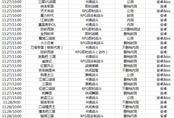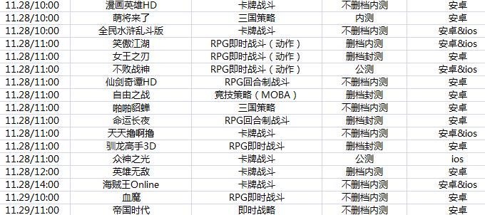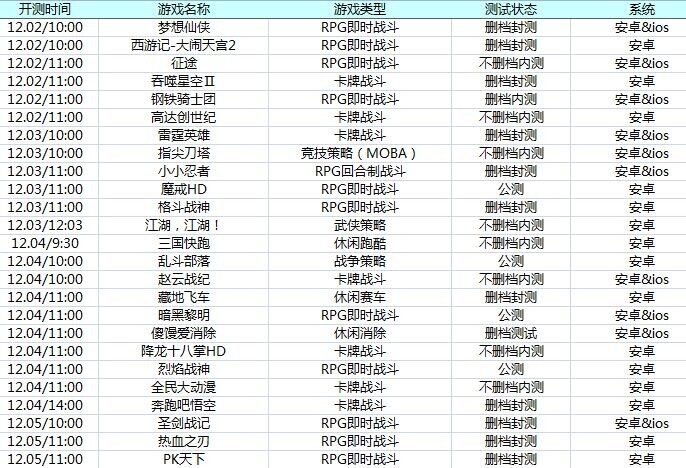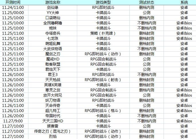 下周游戏开测表